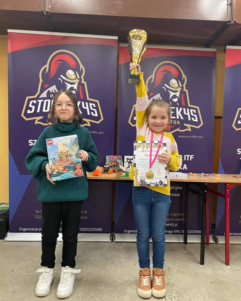 Michalina Kocisz została Mistrzynią województwa podlaskiego w kategorii dziewcząt do lat 7, a Malwiną Chomko wicemistrzynią! Dziewczyny świetnie się spisały, Michalina jednak była niepokonana i to ona stanęła na najwyższym stopniu podium. Przypomnę tylko, że Michalinka dopiero w październiku nauczyła się grać w szachy… 🙂